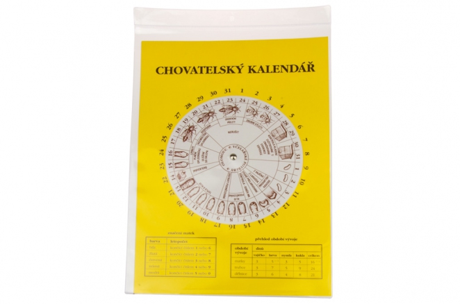 Chovatelský kalendář s otáčecím kolečkem podle data začátku chovu až k rozkladení nové matky.